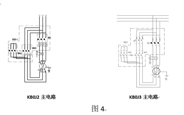 4. KB0J2KB0J3KB02J2KB02J3主電路與普通KB0JKB02J的接線方式區別是KB0KB02主電路接線位置,普通的KB0JKB02J接線方式:接在電源進線端主電路KB0承受的是線電流In。而采用圖4KB0J2KB0J3KB02J2KB02J3)分流的接線方式后,KB0KB02主回路接的位置有一些變化,啟動完成后主開關KB0KB02承受的是相電流In/3(見表4)。KB0J2KB0J3KB02J2KB02J3全壓工作時流過每臺主開關的相電流的計算公式見表4。(電纜的截面積選擇:引至電動機端的電纜截面積承載的電流不小于分流后,流過主開關工作電流值;引至星三角減壓起動器進線端的(進電源端)電纜截面積承載的電流不小于電動機全壓工作時額定電流值。