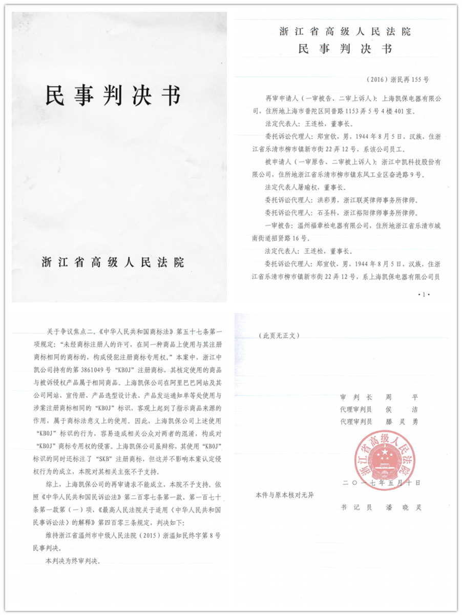 2017年5月10日,浙江省高級人民法院作出終審判決,中凱一場歷時三年的商標維權案終于塵埃落定。本案得從2014年3月說起,因上海凱保長期蓄意侵害中凱商標權,在產品包裝盒、產品標牌、企業官網、產品樣本、廣告等媒介平臺上大量使用與中凱KB0、KB0J、KB0D等商標相似或近似字樣,并有意作一些誤導消費者的宣傳,被中凱訴至法院。樂清市法院受理此案后,通過大量的調查了解,以大量的事實證據為依據,認定上海凱保侵權事實成立,判令上海凱保停止侵權,賠償損失。上海凱保不服,上訴到溫州市中院,溫州市中院通過對案件的審查,最終在充分的事實和證據基礎上作出了維持一審判決的二審判決。上海凱保為達到其不可告人的目的,使出一套“纏”和“拖”的絕技,對二審法院的判決仍然表示不服,向浙江省高院提出再審申請。省高院受理案件后,開庭再審該案,在大量的事實和證據面前,最終作出了維持溫州市中院二審判決的終審判決。這一判決,標志著一些別有用心,惡意侵害或蓄意侵占中凱商標權的不法行為的破滅。