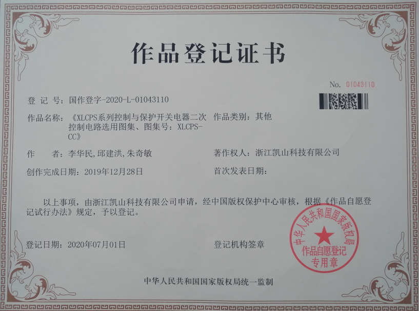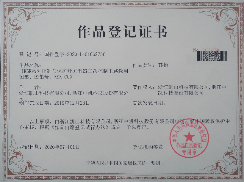 近日,國家版權(quán)局頒發(fā)作品登記證書,由浙江中凱科技股份有限公司全資子公司浙江凱山科技有限公司為著作權(quán)人的兩本在工程設(shè)計及應(yīng)用中的標(biāo)準(zhǔn)設(shè)計圖集獲得作品登記。兩本圖集分別為《XLCPS系列控制與保護(hù)開關(guān)電器二次控制電路選用圖集》(圖集號XLCPS-CC)、《KSK系列控制與保護(hù)開關(guān)電器二次控制電路選用圖集》(圖集號KSK-CC)。