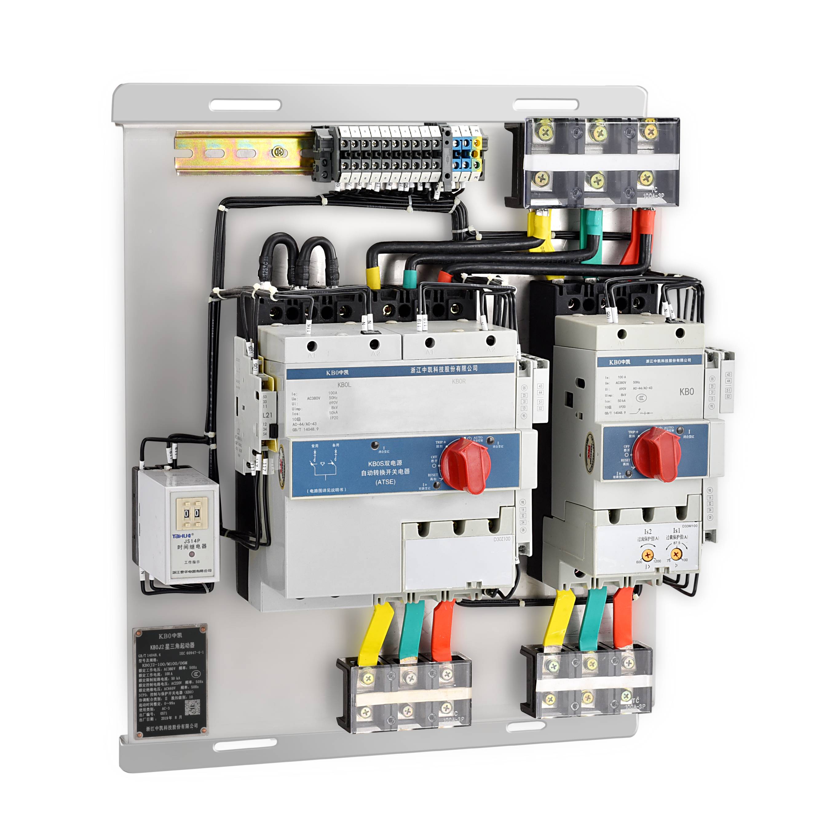 KB0作為主開關,與適當的時間繼電器、電氣聯鎖、機械聯鎖等附件組合,構成Y-△減壓起動器成套單元KB0J2(以KB0-F消防型產品作為主開關,可構成消防型Y-△減壓起動器成套單元KB0J2-F, 具有過負荷僅報警不跳閘,短路時報警+跳閘的功能。)可實現110kW及以下的電動機的Y-△減壓起動控制與保護。
