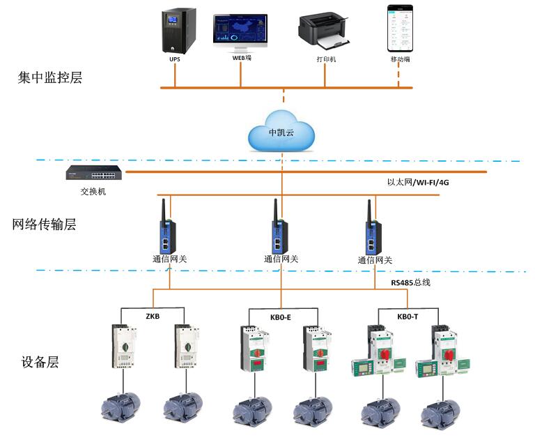 基于中凱物聯網云平臺的電動機智能監控系統,以可通訊KB0作為電機控制與保護的核心元件,并實時采集電動機數據包括:實時電流、實時電壓、故障信息、整定參數等,通過中凱智能網關上傳至中凱云平臺。